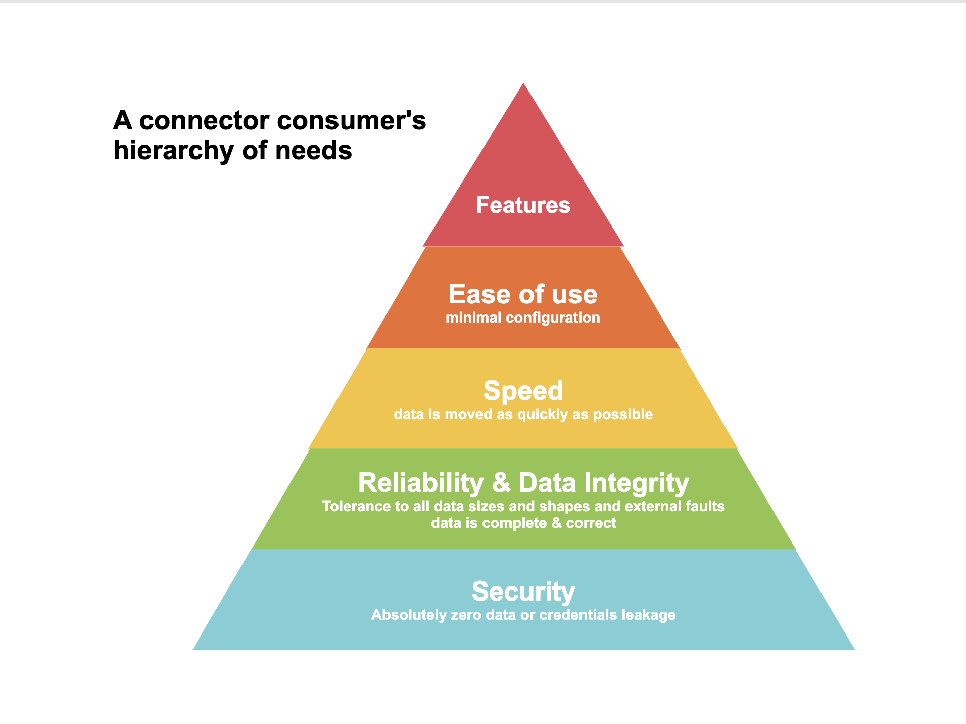 A connector needs to be reliable. Otherwise, a user will need to spend a lot of time debugging, and at that point, they ’re better off using a competing product. The connector should be able to handle large inputs, weirdly formatted inputs, all data types, and basically anything a user should throw at it.